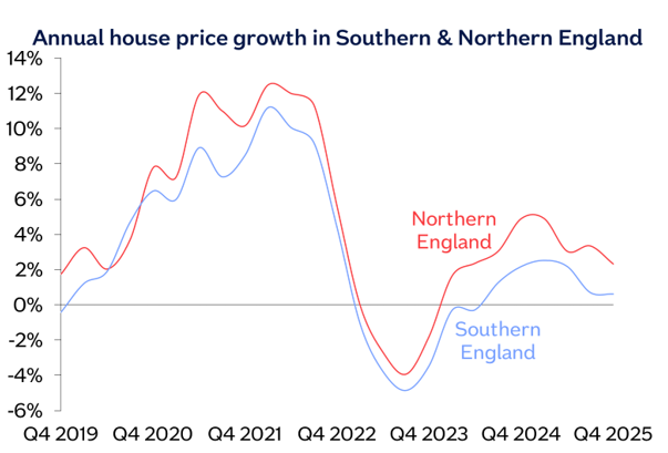 “Average house price growth in Southern England (South West, Outer South East, Outer Metropolitan, London and East Anglia) was similar to last quarter at 0.6%. Annual price growth in London remained subdued, with prices rising by 0.7% in 2025, compared with a 2.0% rise in 2024. East Anglia was the weakest performing UK region and the only one to see an annual decline, with prices down 0.8%, compared with Q4 2024.